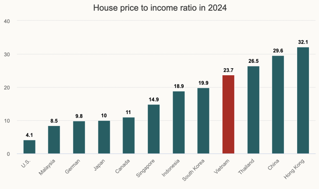Trong giai đoạn 2019-2024, một số quốc gia châu Á khác như Philippines và Indonesia đã thấy tỷ lệ tăng trưởng giá nhà so với thu nhập cao hơn cả so với Việt Nam, lần lượt là 23,69% và 36,83%. Một số quốc gia khác như Hàn Quốc có tỷ lệ tăng trưởng thấp hơn (13,21%). Singapore và Hồng Kông là các ngoại lệ khi tỷ lệ giảm đi lần lượt là 33,8% và 35,05%.